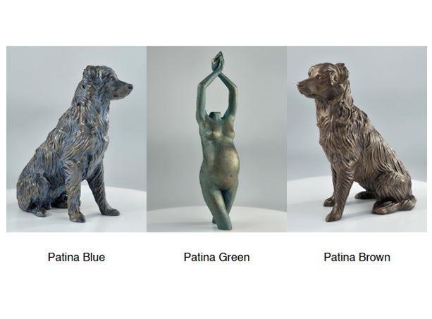 Bronze with patinated surfaces for an artistic and antique touch. The figurines are produced with modern 3D printers in premium resin and receive a handcrafted patina finish, resulting in natural variation and uniqueness.