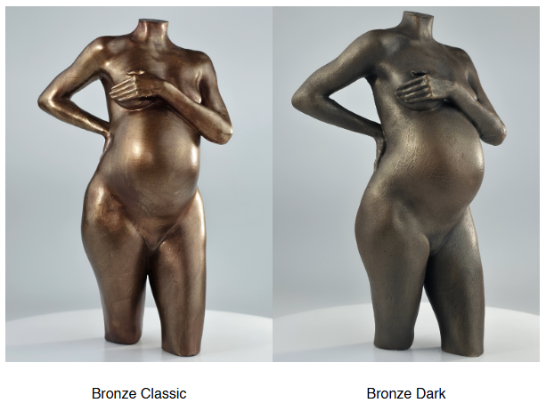 Bronze with patinated surfaces for an artistic and antique touch. The figurines are produced with modern 3D printers in premium resin and receive a handcrafted patina finish, resulting in natural variation and uniqueness.